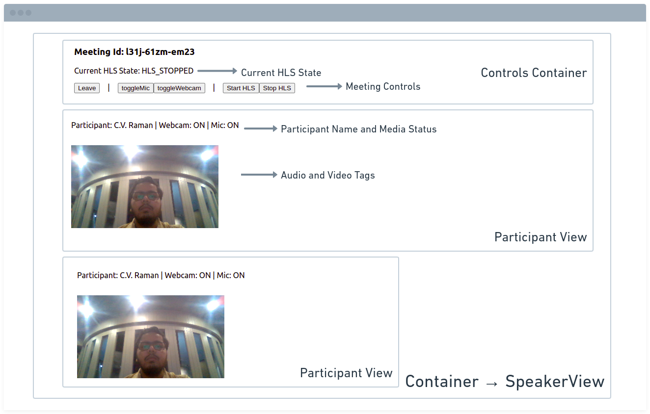 The App will contain a container component which includes a user component with videos. Each video component will have control buttons for the mic, camera, leave a meeting, and HLS.